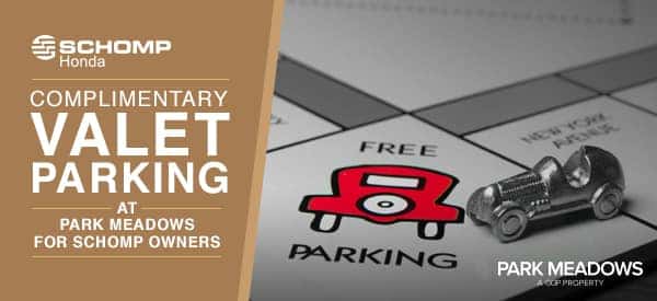 Valet parking is a very appealing perk. Think about having your arms and hands full of bags and packages and the weather has turned chilly – especially during the upcoming holiday shopping season. No more slogging through slushy parking lots for you! This is just one more way that Schomp Honda and Park Meadows are teaming up to thank you for choosing us both.