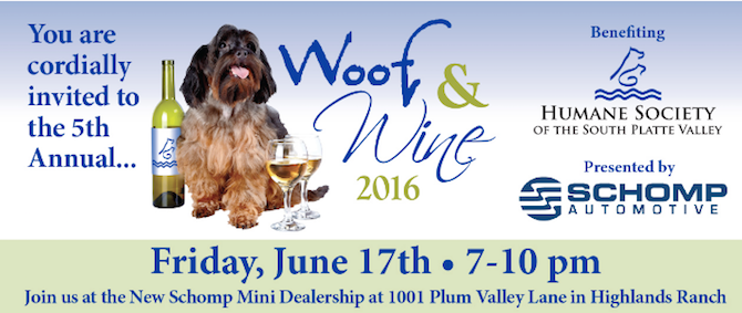 Save the date! Help our furry friends at the Humane Society of the South Platte Valley’s (HSSPV’s) fifth-annual Woof & Wine charity event, hosted by Schomp Honda. Taking place on Friday, June 17 from 7-10pm, the event will be held on our outdoor experience deck at 1001 Plum Valley Lane, Highlands Ranch, CO 80129. Tickets are available for $75 at www.hsspv.org/woofandwine, with all proceeds directly benefitting the animals of the HSSPV.