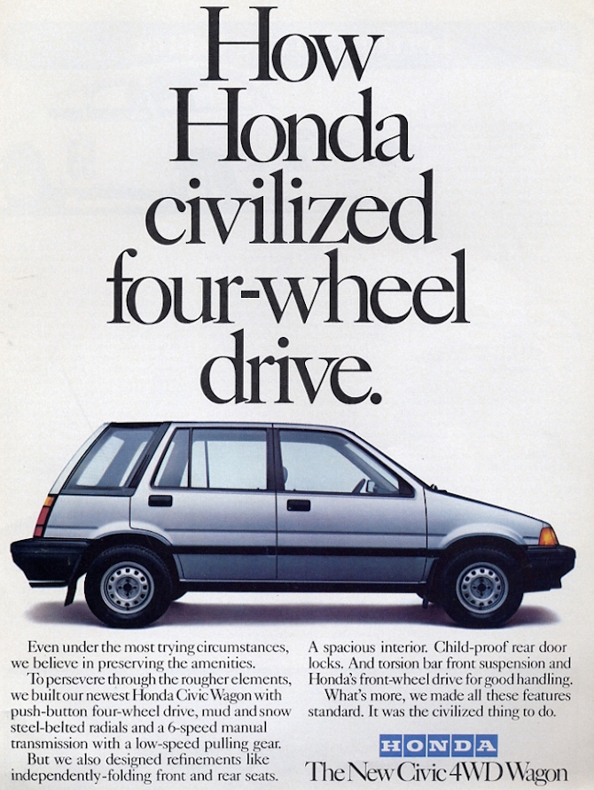 Back in 1985, Honda introduced a part-time four-wheel-drive system on the Civic Wagovan, revolutionary for its time and within its segment. Engaged by a pushbutton on the dashboard, the driver could select front- or four-wheel drive modes depending on the need for traction. Two years later, a “Real-Time” four-wheel drive system was introduced, offering the Civic an automated, button-free transition from front- to all-wheel drive. Powering only the front wheels in most driving situations, the system offered an economical way to prioritize traction and economy in most driving situations.